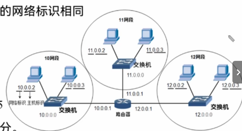 IP地址组成:前面为网络标识,后面为主机标识。同一网段的网络标识相同