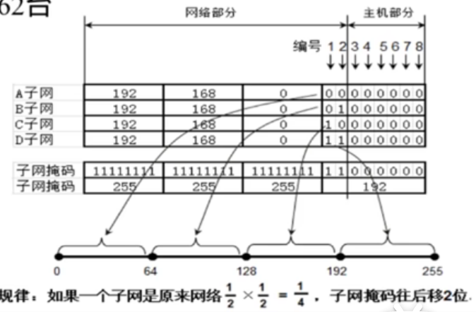 借2位,可等分成2^2=4个子网,掩码变为255.255.255.192,各网主机2^6-2=62台