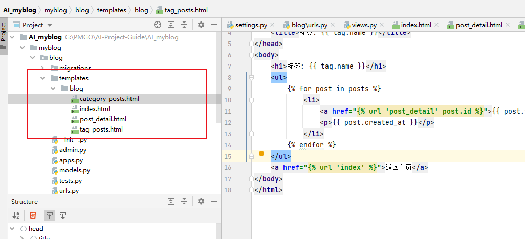 在Django中,URL和视图是处理HTTP请求的核心部分。URL配置负责将特定的URL映射到相应的视图函数,视图函数则负责处理请求并返回响应。我们将创建几个基本的视图,包括博客主页、文章详情页、分类页和标签页。