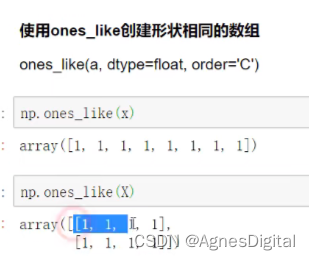 格式中,x代表一个已存在的数组,该代码会创建一个与该数组形状相同,但元素全替换为1的数组。