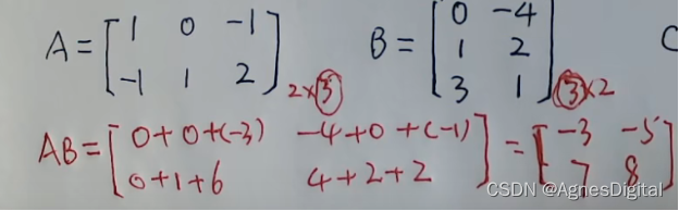 数学上,对于两个矩阵A与B,AxB代表以A的每一行乘以B的每一列。例子: