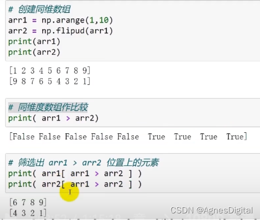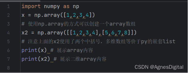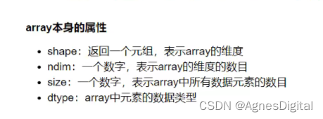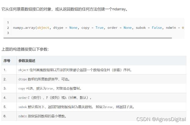 array数组是numpy库提供的核心对象之一,其功能与py本体的list类似,但功能更加强大且更适合储存数据以进行数据分析,如支持更多的查询指令(效率远高于for遍历),只允许储存同一类型的数据,可创建多个维度等等。