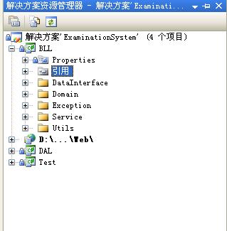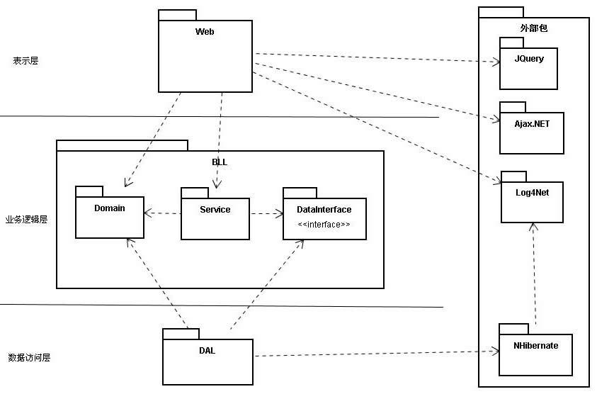 包在.net中对应的术语是命名空间。在线考试系统划分了三个大的命名空间,分别是Web(包括表示层的内容)、BLL(包括业务逻辑层的内容)和DAL包括了数据访问层的内容。其中BLL包括了5个子命名空间,分别是Domain、 DataInterface、Service、Utils和Exception。系统还使用了其他的外部类库,包括Ajax.net,Jquery,NHibernate,Log4Net等。图3-3是系统包图,展示了包之间的依赖关系。另外两个是工具类和自定义异常包,由于与核心设计关系不大图上没有说明。