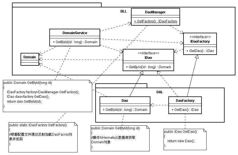 为了简单,该图的IDao接口只有一个数据操作方法GetById当然还可以有Save,Update,Delete等方法。IDaoFactory里也只有一个工厂方法GetDao具体实践时候应该是每一个领域类都有一个Dao对象与之对应。比如IStudentDao、ITeacherDao等。而IDaoFactory应该对应的工厂方法可能有GetStudentDao、GetTeacherDao等等。可以看到各个类的依赖关系不存在从业务层到数据层的依赖。当我们想要获得一个具体Dao对象时候,我们先从DaoMangager那里通过反射获得具体DaoFactory的实例。这样我们就可以通过DaoFactory来获得具体的Dao对象了。将依赖关系倒置后我们就可以动态的切换数据访问层。因为我们的业务层不依赖与具体的数据访问层,而是依赖与数据访问层接口。