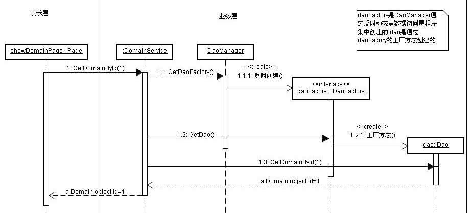 从图上可以看出消息是如何在各层之间传递的首先从显示信息的。showDomainPage发送请求给DomainService服务对象,请求获得id号为1的Domain对象。DomainService从DaoMangager那里获取具体daoFactory对象。DaoManager是根据配置文件动态的加载数据访问层程序集,然后利用反射创建daoFacotry对象的。有了daoFactory,DomainService对象再从daoFactory的工厂方法里获得自己需要的dao对象。最后通过dao对象得到最终需要的id=1的Domain对象。并返回给Page对象。Page对象最后在将Domain对象的内容绑定到页面上显示给用户。这里只是简单的展示了请求是如何在各层之间传递的。当然实际的请求可能更加的复杂。关于如何删除,添加,修改等操作和显示操作的交互方式是类似的这里就不多介绍了。
