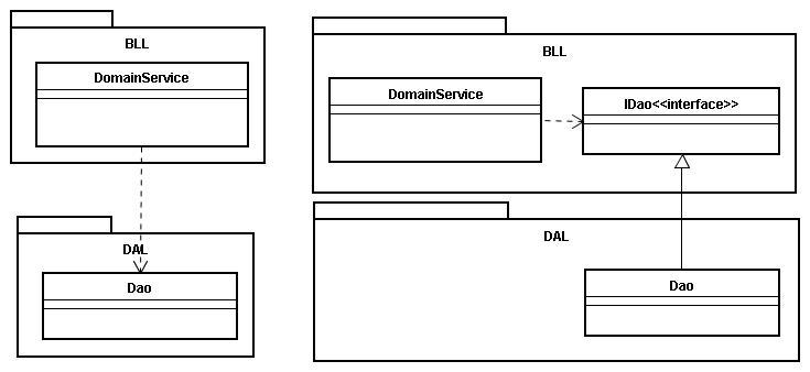 由于BLL层是整个系统的核心部分,所以表示层和数据访问层都应该依赖与BLL层。就是说要实现数据访问层对业务层的依赖倒置,这需要使用分离接口来实现。如图3-9所示,左图为业务层依赖数据访问层。右图为分离接口后倒置的依赖关系。