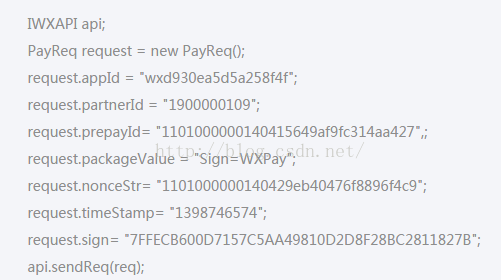 10.req.packageValue=”Sign=WXPay”,一般都是这样写死这个参数值。也有人说写成req.packageValue=”prepay_id=” + prepayid,经测试Android两种写法都是可以调起微信支付的,至少最新版本SDK是可以的,以后则不清楚,官方也建议写Sign=WXPay,据说iOS只支持这种写法。