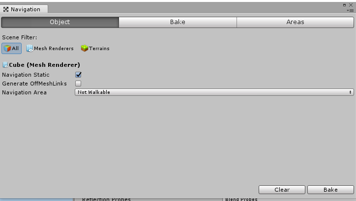 则需要对平面和长方体进行烘焙处理,保证能为胶囊体的运动自动开辟出一条路线,烘焙的关键在于Navigation Area参数的选择