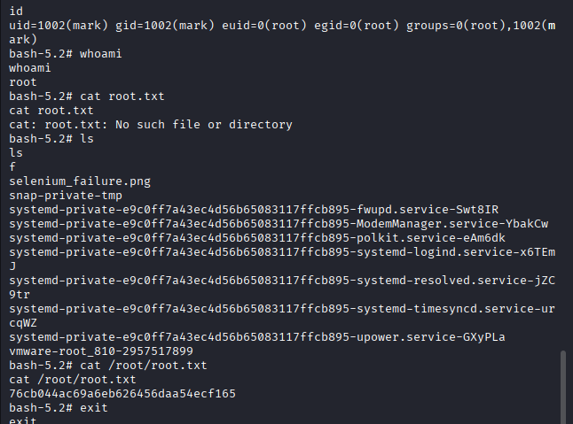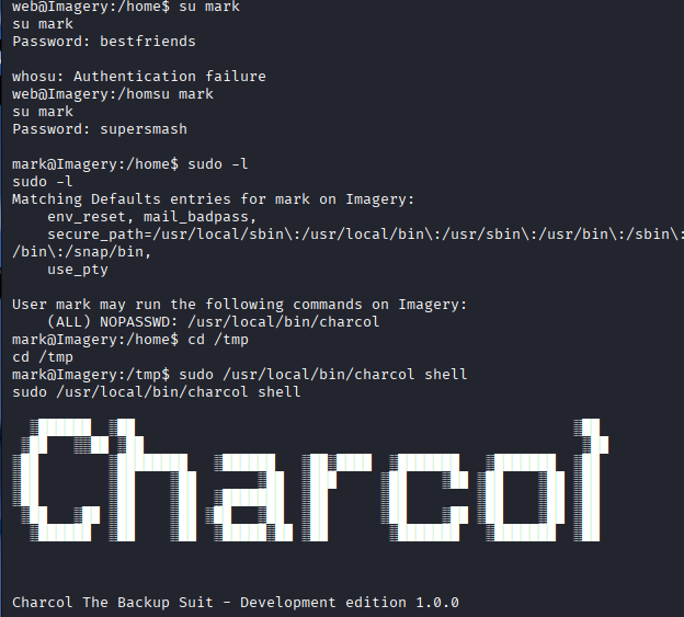 ssh没成功,直接su切换到mark用户,开始提权,发现charcol: