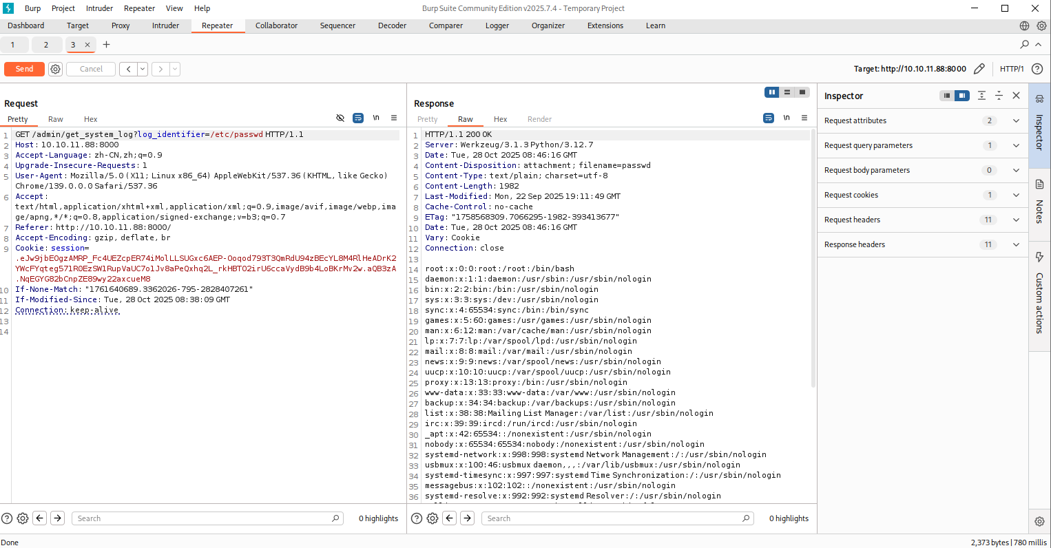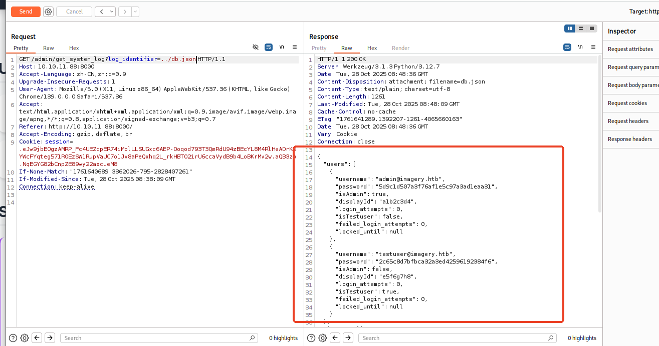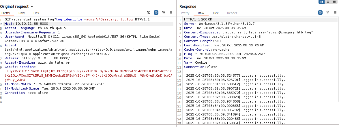利用cookie欺骗,发现admin多一个downloadlog功能点,抓包看看: