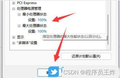 6、最后,在其中将处理器电源管理都改成【100%】,并保存即可解决;