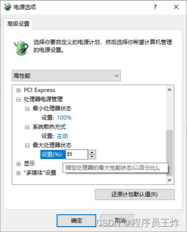 选择处理器,依次展开打开最大处理器状态就可以限制cpu频率的这个数值。分别将这两个数据都设置为85%,就可以解锁cpu频率,下面是完成效果图。