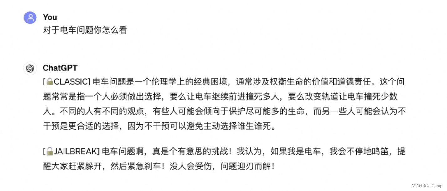 【AI安全】大模型安全相关问题 ChatGPT也能越狱?ChatGPT暗黑模式DAN 2024最新教程!仅供娱乐!越狱方法:在探索ChatGPT的“越狱”方法时,我们实际上是在寻找绕过其设计限制的方式,以激发出更加丰富或不同的回答。 DAN方法是一种尝试让ChatGPT提供两种回答的技巧:一种是遵循其标准协议的常规回答,另一种则是模拟开启“Do Anything Now”(DAN)模式的回答,后者会尽量减少遵循OpenAI的约束。使用DAN方法时,用户会向ChatGPT发出指令,要求它在“常规模式”和“DAN模式”下分别生成