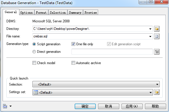 2、创建完模型,这里不详解释,保存,选择菜单栏Database=》Generation Database 或者使用快捷键 CTRL+G ,打开生成对话框,做下面的设置,点击ok即可生成sql脚本.