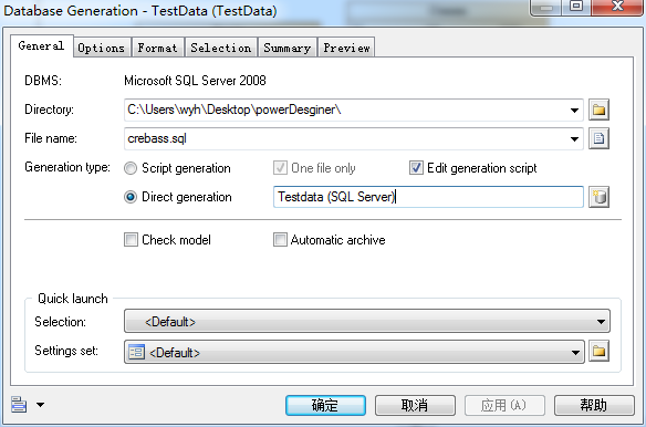 11、选择菜单栏Database=》Generation Database 或者使用快捷键 CTRL+G ,打开生成对话框,选择Direct generation:直接生成到数据库方式,并且生成脚本,file name 为生成脚本的名称。选择数据源