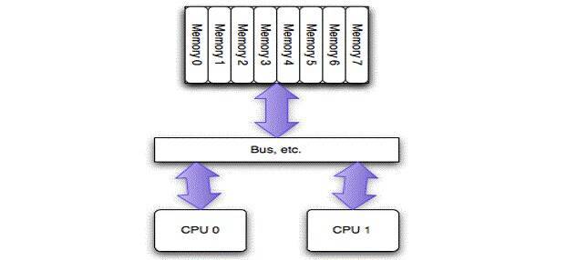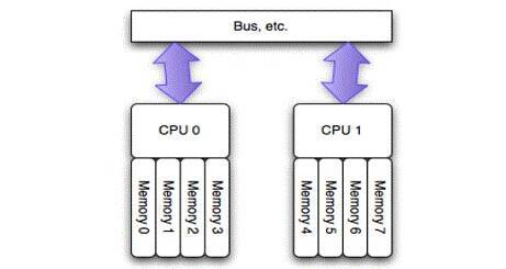 在NUMA架构中,每一颗CPU被称为一个node,每个node之间的内存使用的独立的。首先我们来看下传统模式SMP的情况: