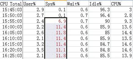 首先对于CPU的利用率而言,SYS%的消耗在故障时间点开始,突然变高,如下:
