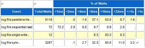 从这里,我们可以清楚的看到,log file parallel write等待,其中有38.9%的等待是小于8ms的,其他是超过8ms,在8sms和32ms之间.