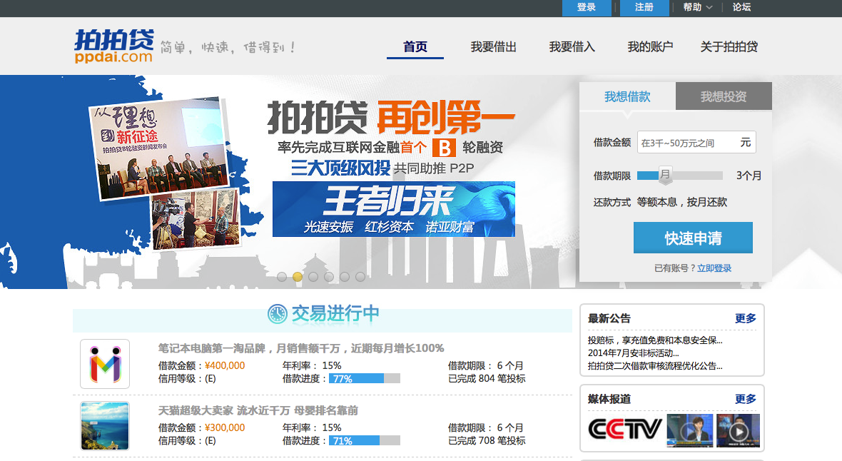 例如响应时间最快的拍拍贷,页面比较简洁,很容找到“借款”模块和“贷款”模块的入口。而目前,互联网金融最重要的商业模式就是这样的民间借贷融资平台。随着国家对于民间借贷管制的松动,这样的平台目前在国内是越来越多。不过,当看到拍拍贷首页的焦点图在庆祝成立7周年时,也就是说07年左右的时候P2P就开始暗潮涌动了。