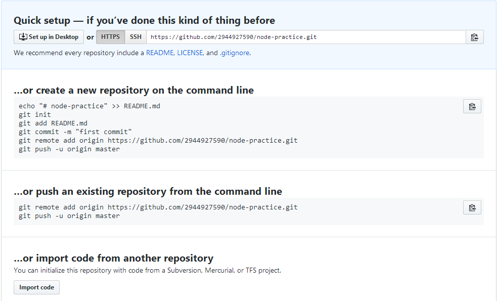 $ git remote add origin https://github.com/2944927590/node-practice.git $ git push origin master Counting objects: 13, done. Delta compression using up to 4 threads. Compressing objects: 100% (5/5), done. Writing objects: 100% (13/13), 1.03 KiB | 0 bytes/s, done. Total 13 (delta 0), reused 0 (delta 0) To https://github.com/2944927590/node-practice.git * [new branch] master -> master
