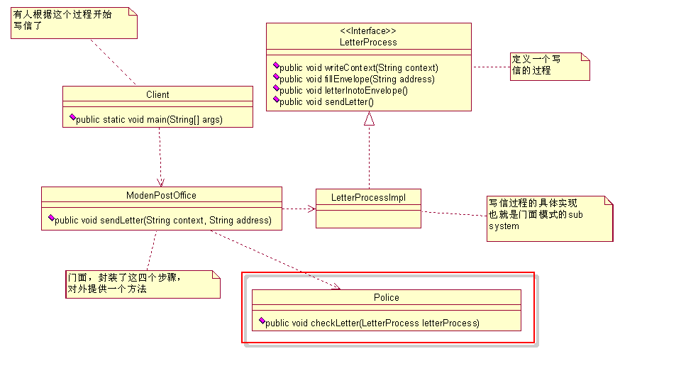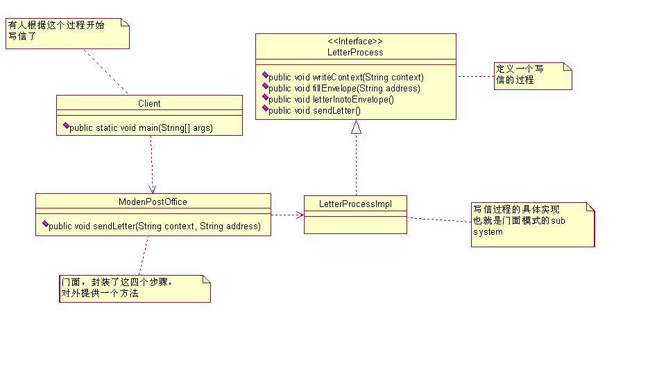 这就是门面模式,还是比较简单的,Sub System 比较复杂,为了让调用者更方便的调用,就对Sub System进行了封装,增加了一个门面,Client 调用时,直接调用门面的方法就可以了,不用了解具体的实现方法以及相关的业务顺序,我们来看程序的改变,LetterProcess 接口和实现类都没有改变,只是增加了一个ModenPostOffice 类,我们这个java 程序清单如下: