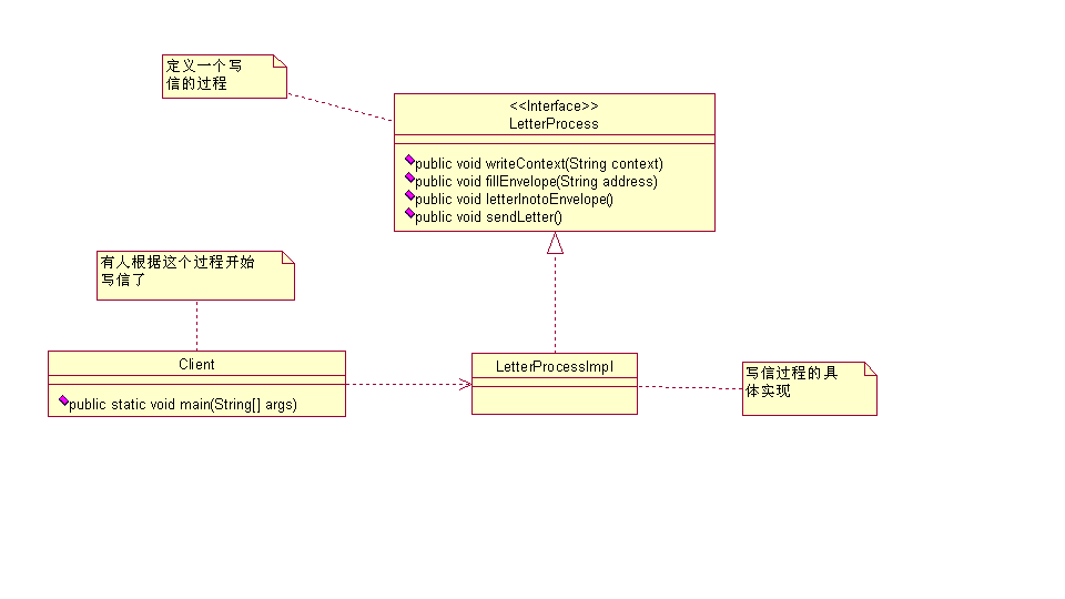好,我们继续讲课。大家都是高智商的人,都写过纸质的信件吧,比如给女朋友写情书什么的,写信的过程大家都还记得吧,先写信的内容,然后写信封,然后把信放到信封中,封好,投递到信箱中进行邮递,这个过程还是比较简单的,虽然简单,这四个步骤都是要跑的呀,信多了还是麻烦,比如到了情人节,为了大海捞针,给十个女孩子发情书,都要这样跑一遍,你不要累死,更别说你要发个广告信啥的,一下子发1 千万封邮件,那不就完蛋了?那怎么办呢?还好,现在邮局开发了一个新业务,你只要把信件的必要信息高速我,我给你发,我来做这四个过程,你就不要管了,只要把信件交给我就成了。我们的类图还是从最原始的状态开始: