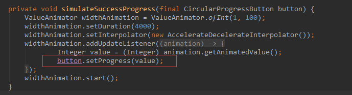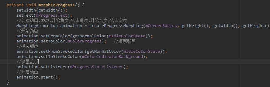 在createProgressMorphing() 中为创建一个MorphingAnimation实例, 其主要设置动画的圆角,宽度,颜色等等 ,在0中的简单实现也用到了这个类中的一些代码(