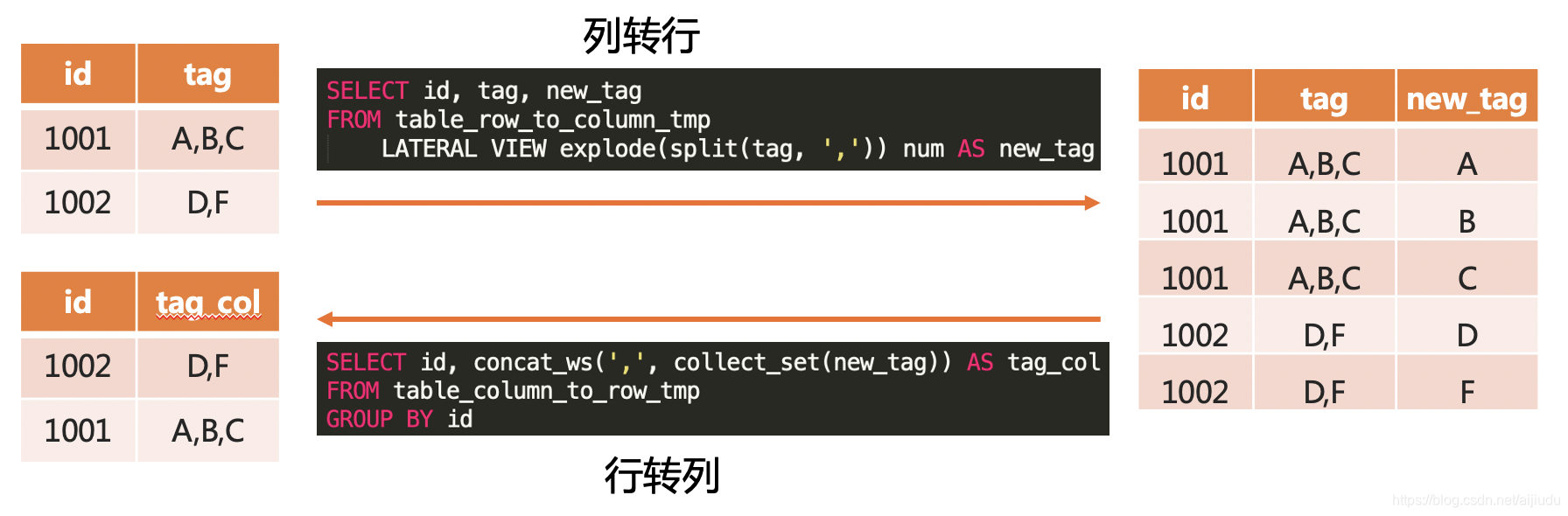 列转行 (对某列拆分,形成新列) :lateral view explode(split(column, ',')) num
