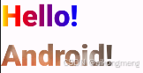 【Jetpect Compose】 文本渐变色 的数组,其中包含了一系列的浮点数和对应的颜色对。每个对表示在水平梯度中的位置(以 0 到 1 之间的浮点数表示)和相应的颜色。中,设置画笔为之前创建的渐变画笔 brush ,还可以设置文本的字体粗细为。如图, 创建一个带有水平渐变颜色的文本组件,并对其样式进行了特定的设置,数组作为参数传递给它,以确定渐变的颜色分布。组件来显示文本 “Android!也可以用图片当做画笔,效果上图的Android。函数创建一个水平渐变的画笔。首先,定义了一个名为。