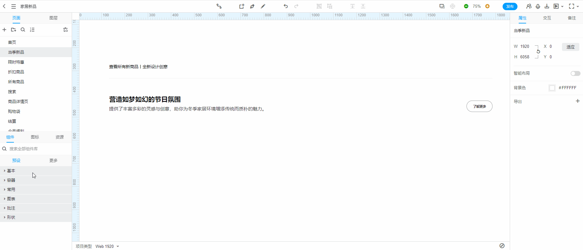 网页界面设计完成后,开始交互设计。可以在右侧的属性栏中添加交互效果,或者点击组件右上角小红圈添加交互。