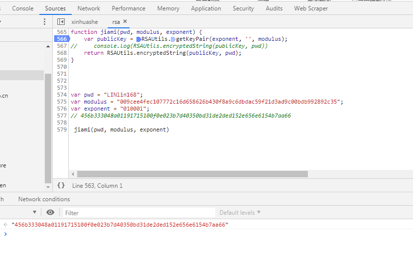 function jiami(pwd, modulus, exponent) { var publicKey = RSAUtils.getKeyPair(exponent, '', modulus); console.log(RSAUtils.encryptedString(publicKey, pwd)) return RSAUtils.encryptedString(publicKey, pwd); } var pwd = "LINlin168"; var modulus = "009cee4fec107772c16d658626b430f8a9c6dbdac59f21d3ad9c00bdb992892c35"; var exponent = "010001"; // 456b333048a01191715100f0e023b7d40350bd31de2ded152e656e6154b7aa66 jiami(pwd, modulus, exponent)
