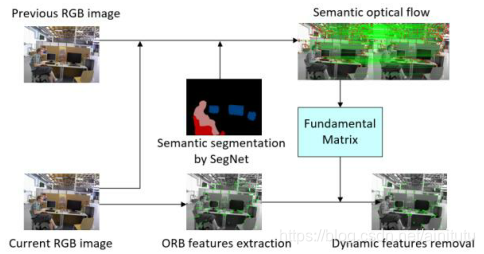 在面向动态环境的SLAM问题中,SegNet的语义分割结果有助于去除动态特征,但分割结果实际上与场景的运动情况无关。也就是说,无论场景中的对象是否是动态的,分割结果都应该是相同的。