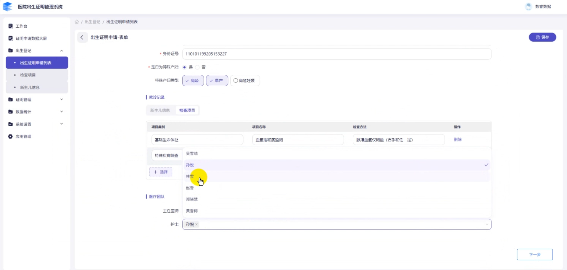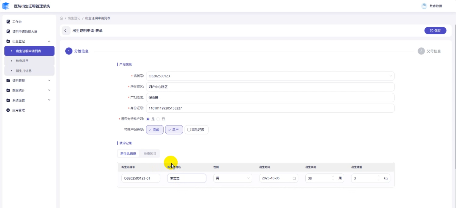 • 选择病历号后,系统自动带出产妇信息、新生儿列表等关联数据,无需手动输入,确保数据准确一致。特殊产妇"选择"是"时,才显示特殊类型选择字段