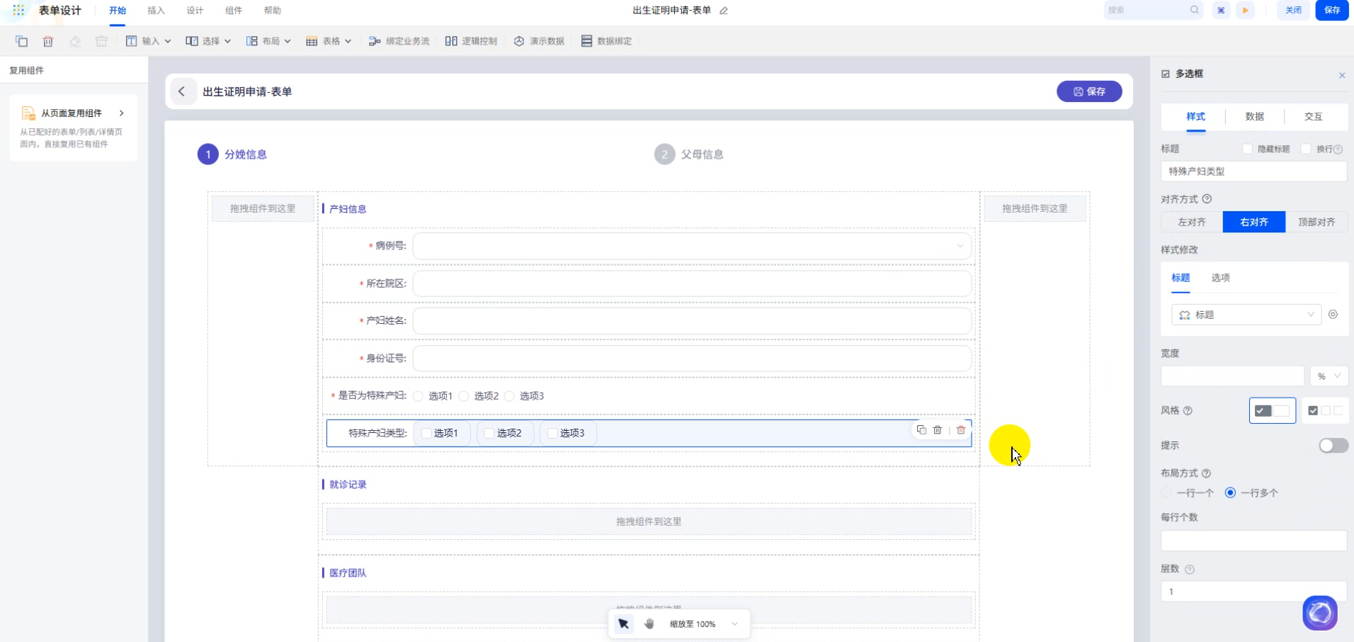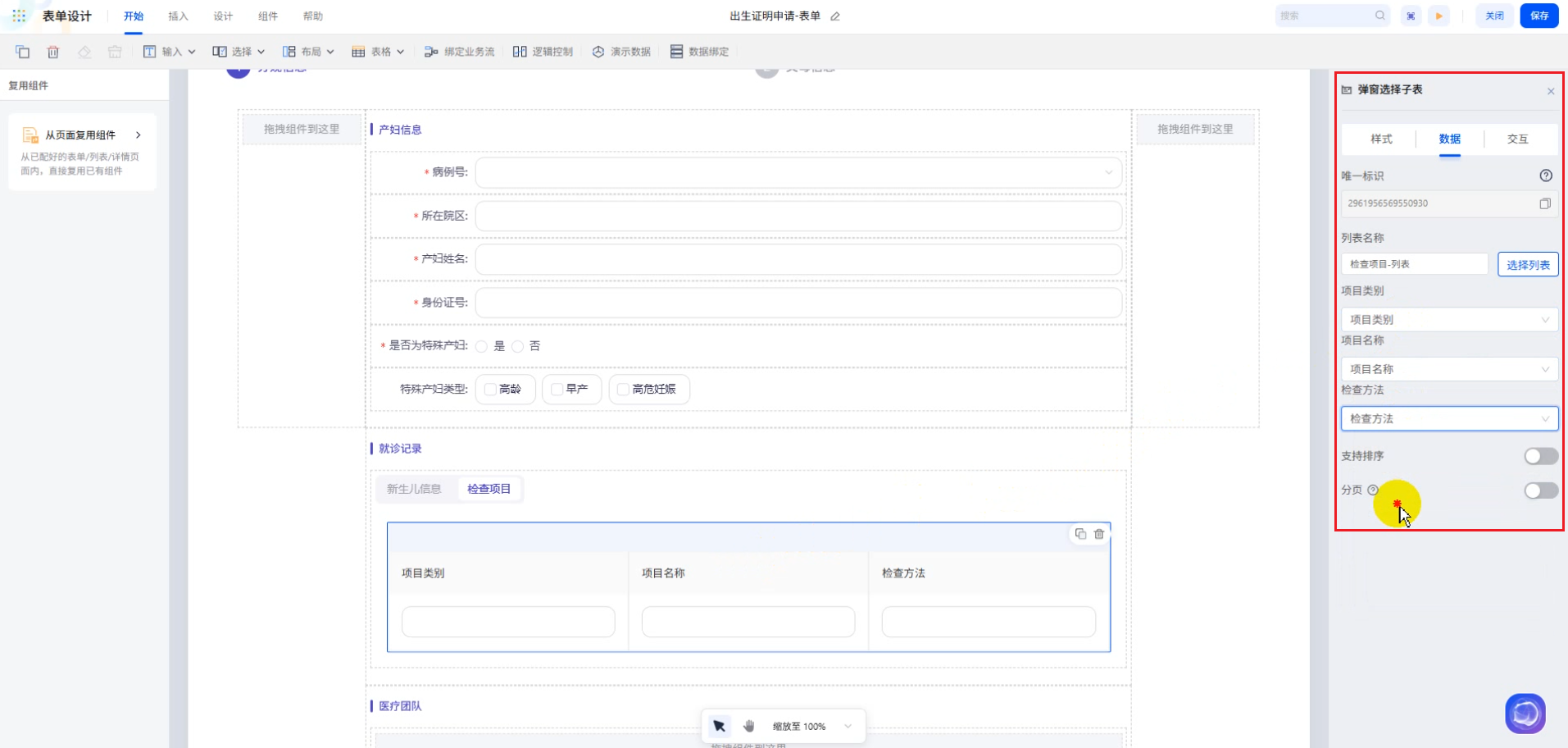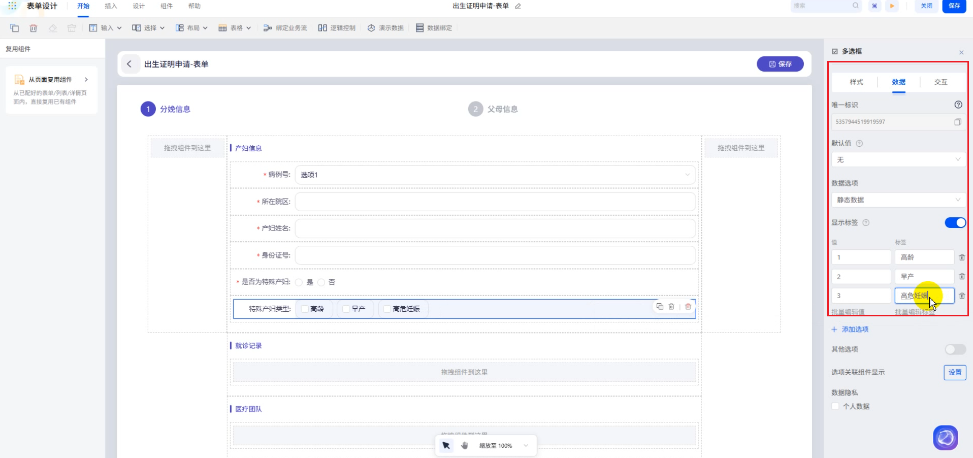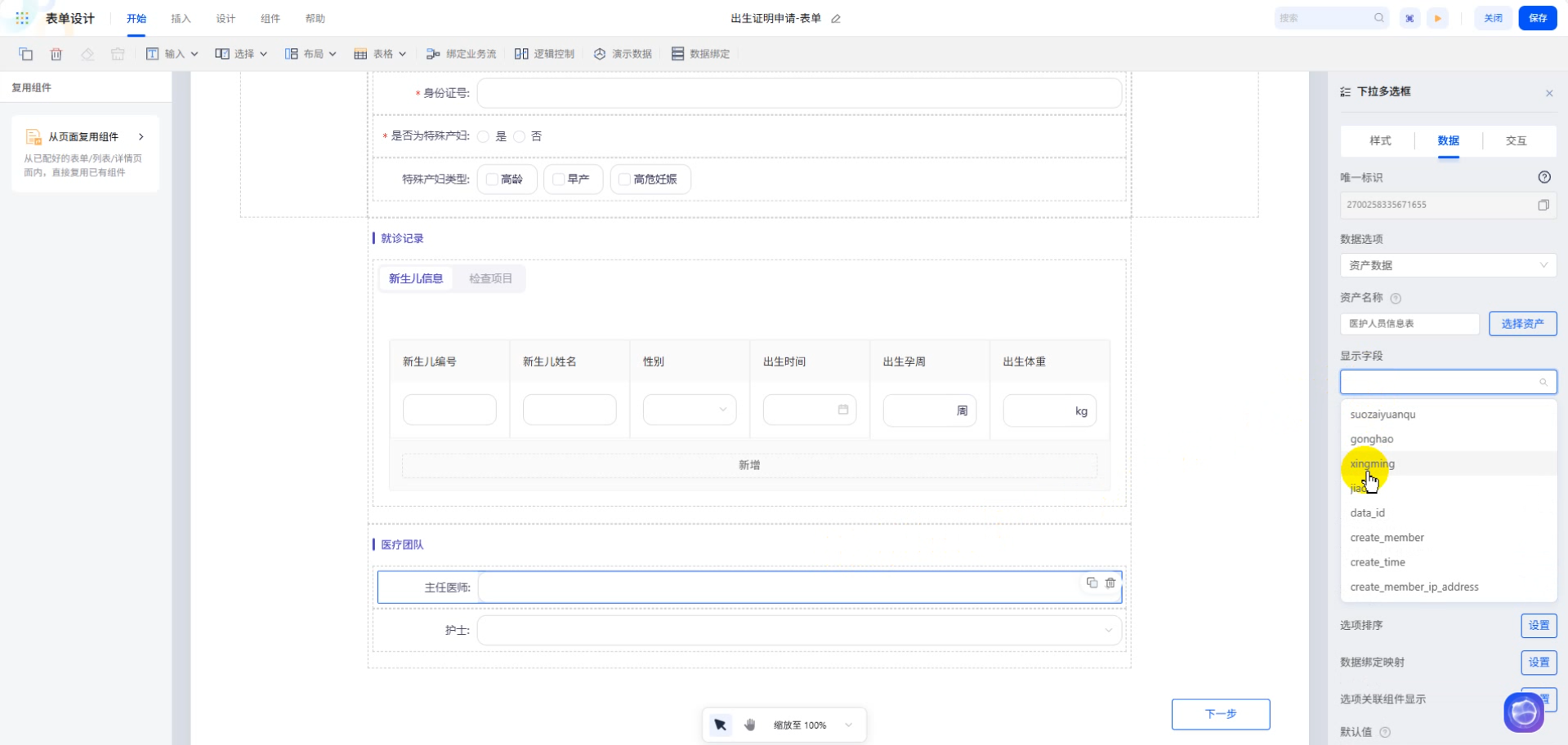 在医疗团队模块下,我们可以拖入下拉多选框组件实现一次选择多位医生信息,绑定医生信息资产作为下拉多选框选项。