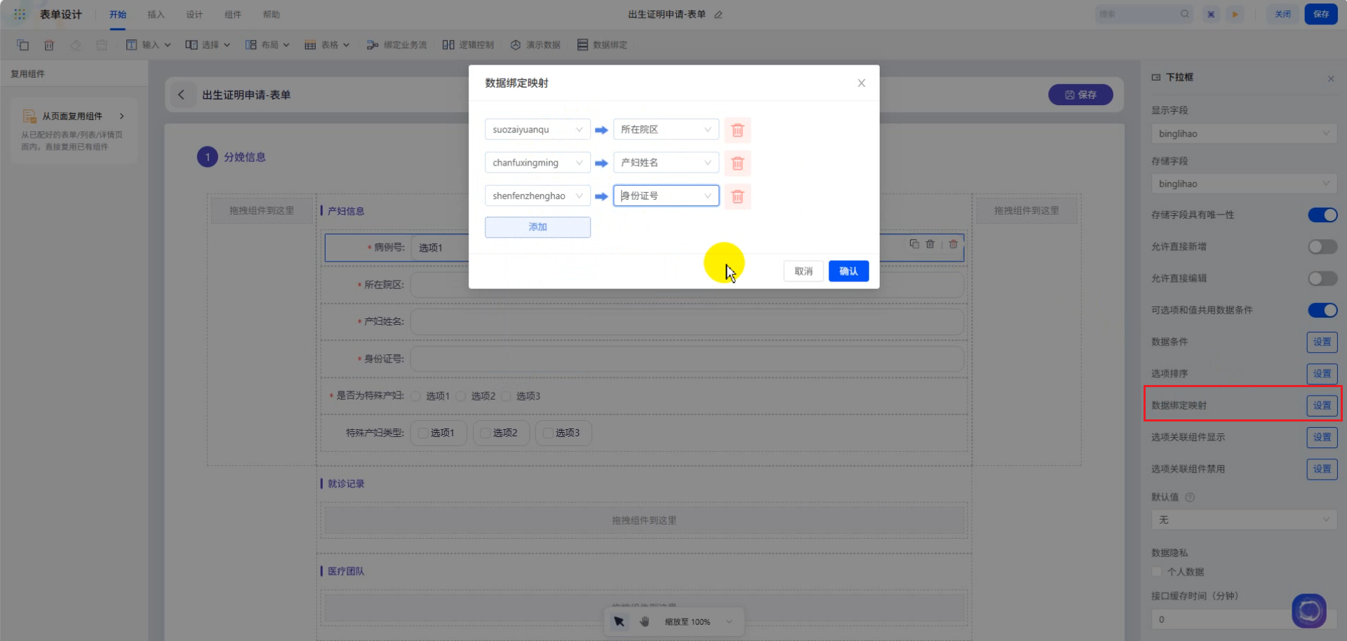 接下来,通过点击【数据绑定映射】,即可将选项关联的其他字段自动填充到表单的对应组件中。