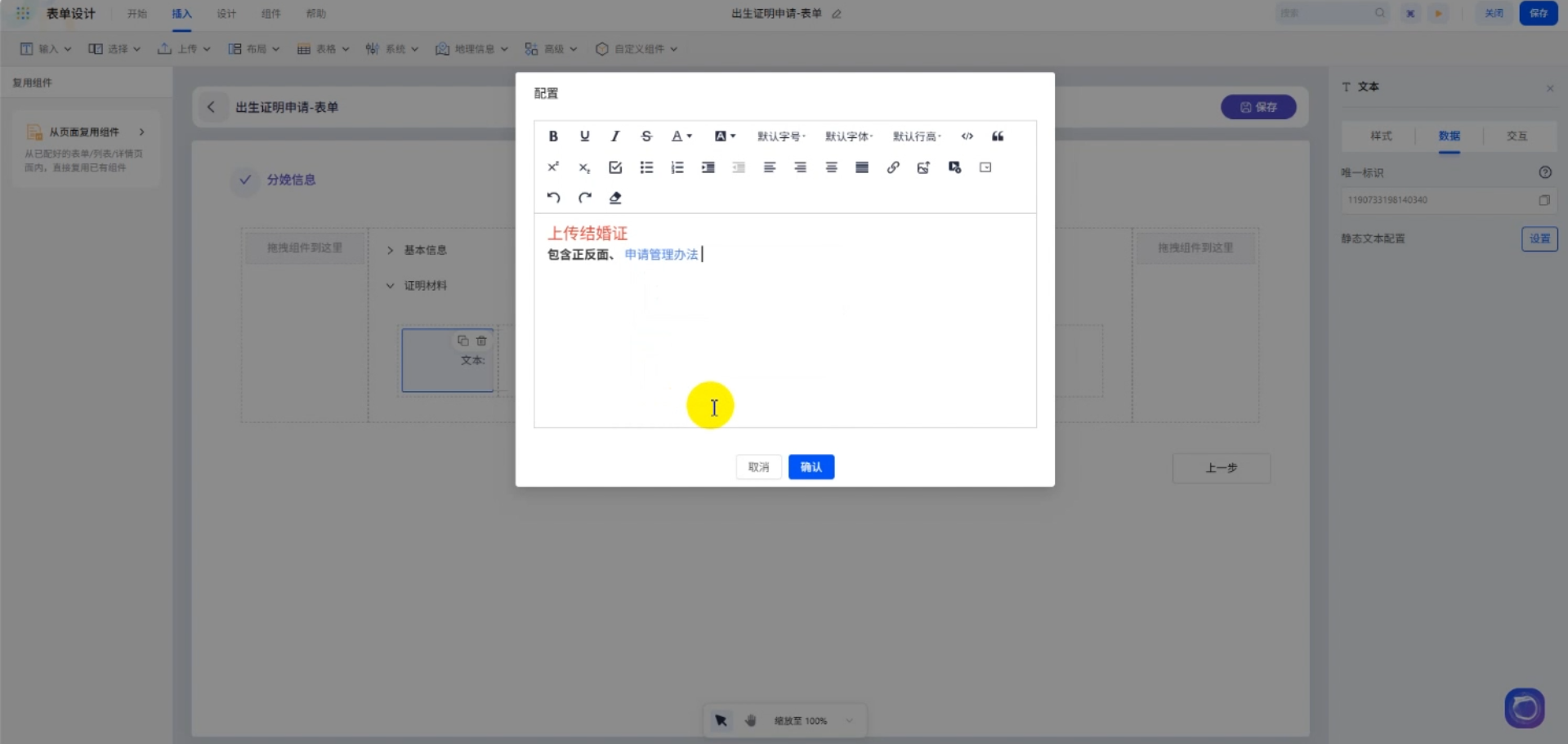 清晰的操作指引是确保用户正确上传文件的关键。文本组件不仅能呈现文字,调整字号、颜色,还能直接插入超链接,引导用户查看官方政策。