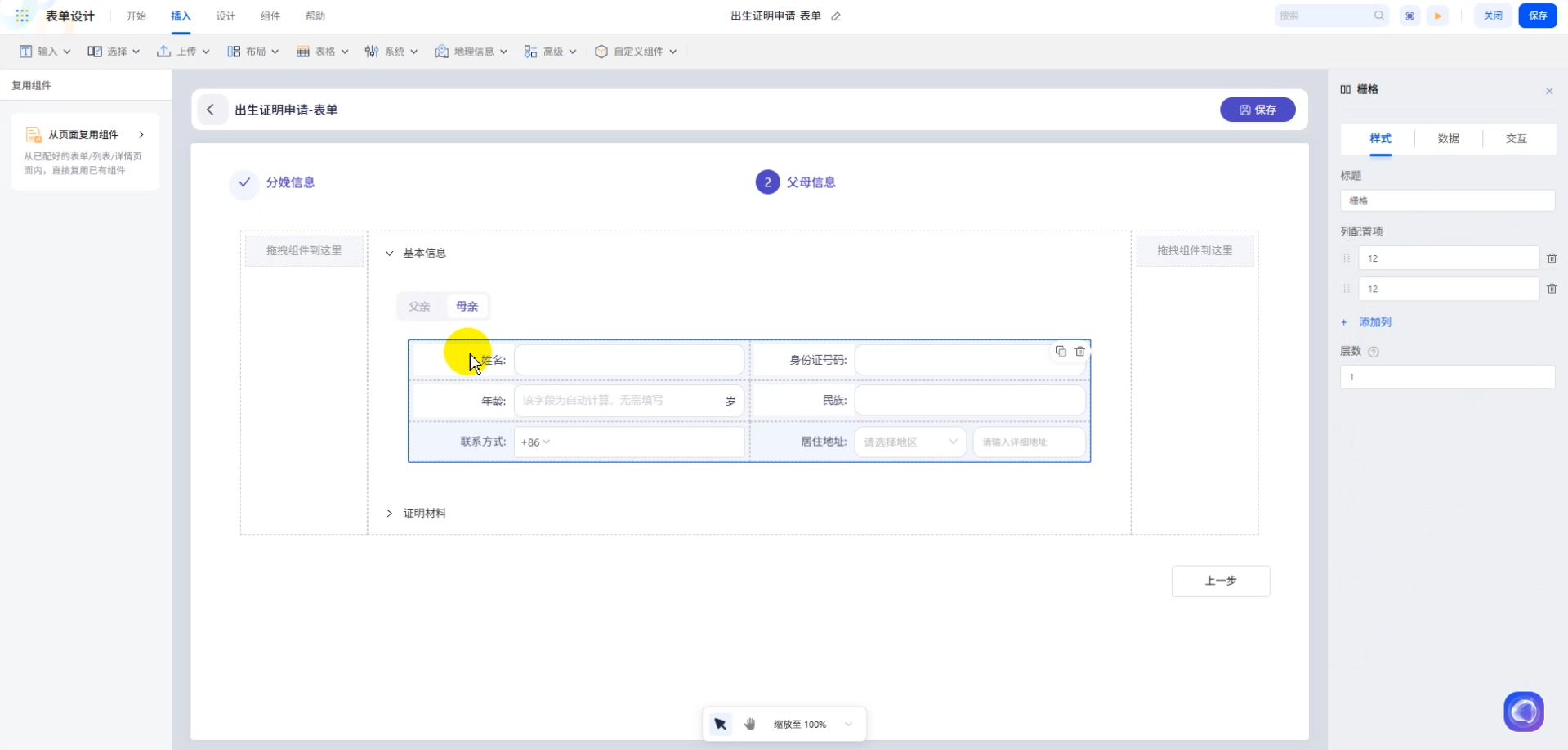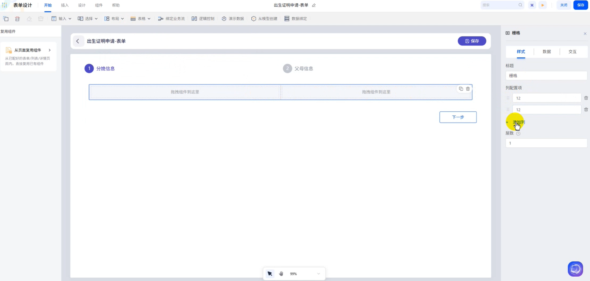 在“分娩信息”步骤中,进一步使用栅格布局与群组组件对字段进行归类和分组,确保界面整洁、逻辑清晰。