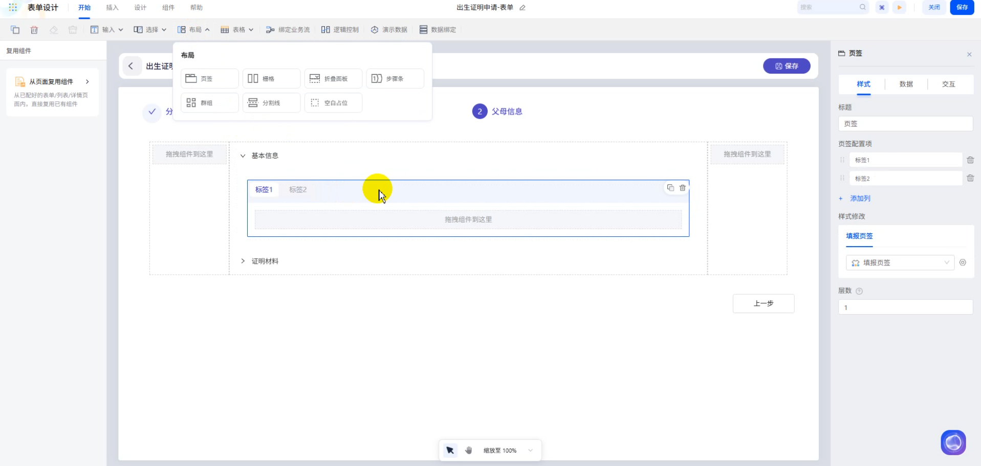 • 表单布局与交互设计:通过步骤条、栅格、页签、折叠面板等布局组件,实现复杂表单的清晰分类与流畅填写体验;