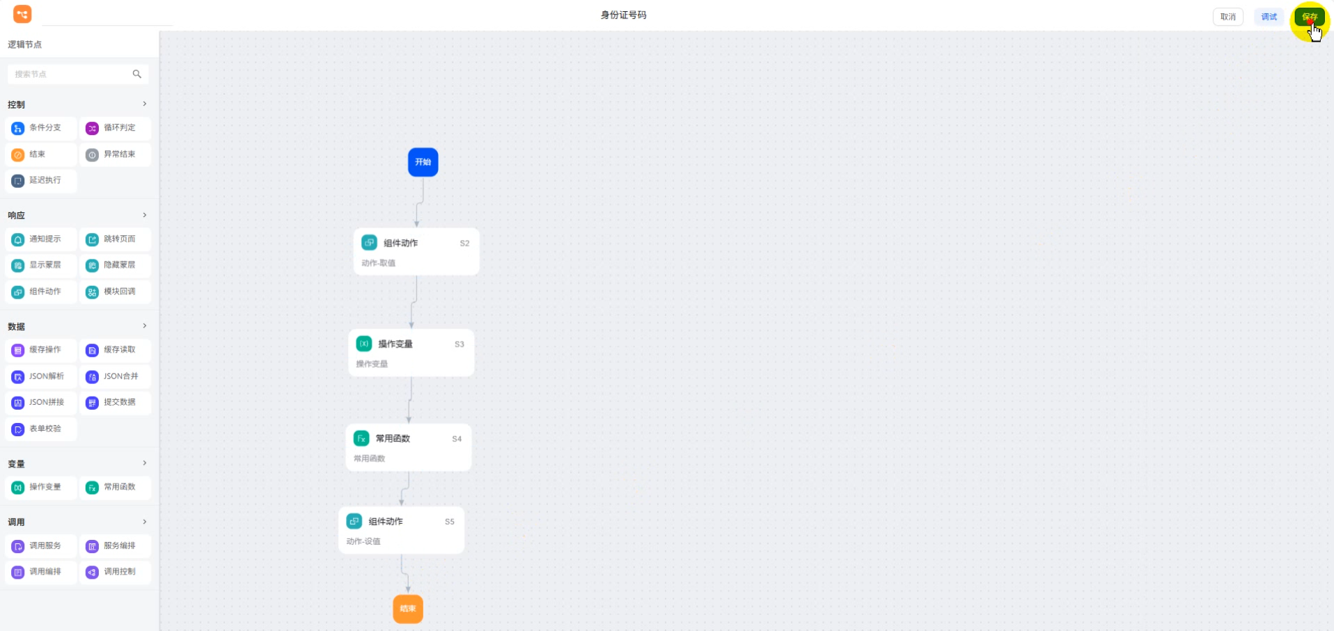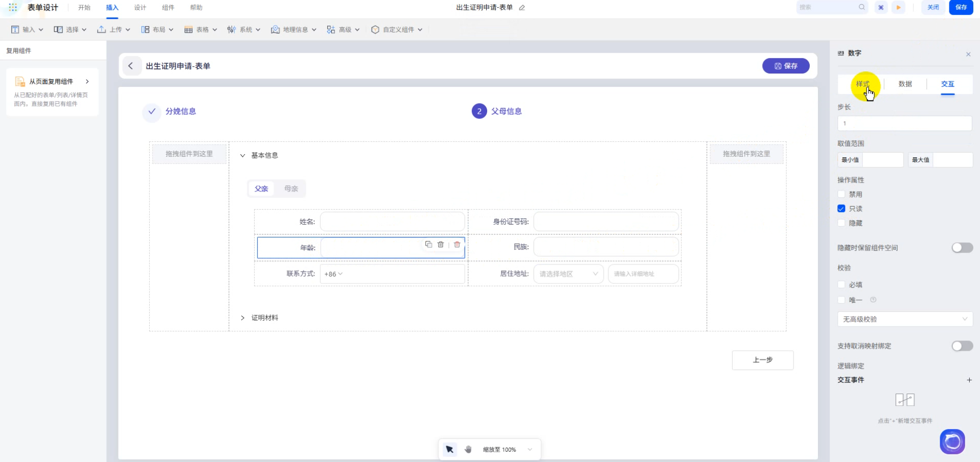 在实际场景下,用户输入身份证号后,应该自动计算出年龄。我们可以为身份证组件添加交互逻辑,当用户输入身份证号后,系统获取生日信息,并进行计算,最终将计算结果赋值年龄组件。