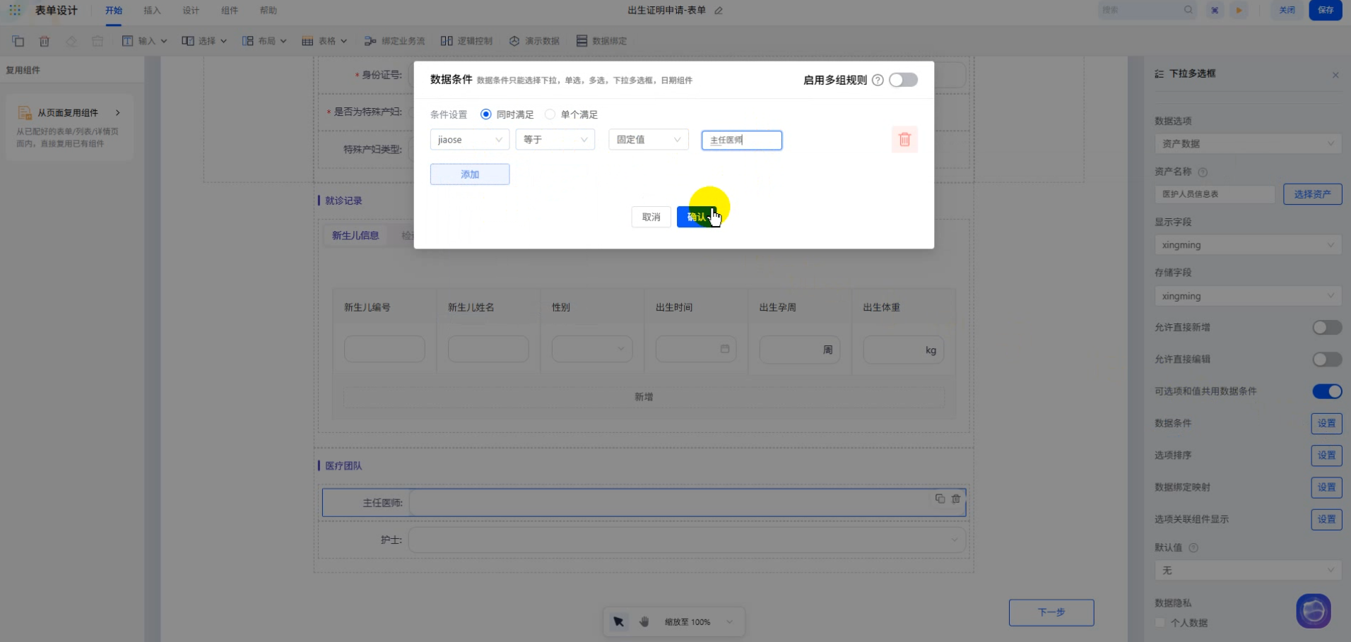 由于医生与护士信息存放在同一数据资产中,我们需要分别设置数据条件,只有当医生信息资产中的【角色】字段等于医生或护士时,才作为可选项。