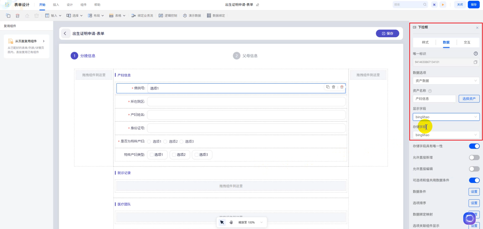 要实现此效果,只需选中下拉框组件,关联我们已预先准备好的产妇信息数据资产,选择病历号作为显示与存储字段。即完成了下拉框的选项设置。