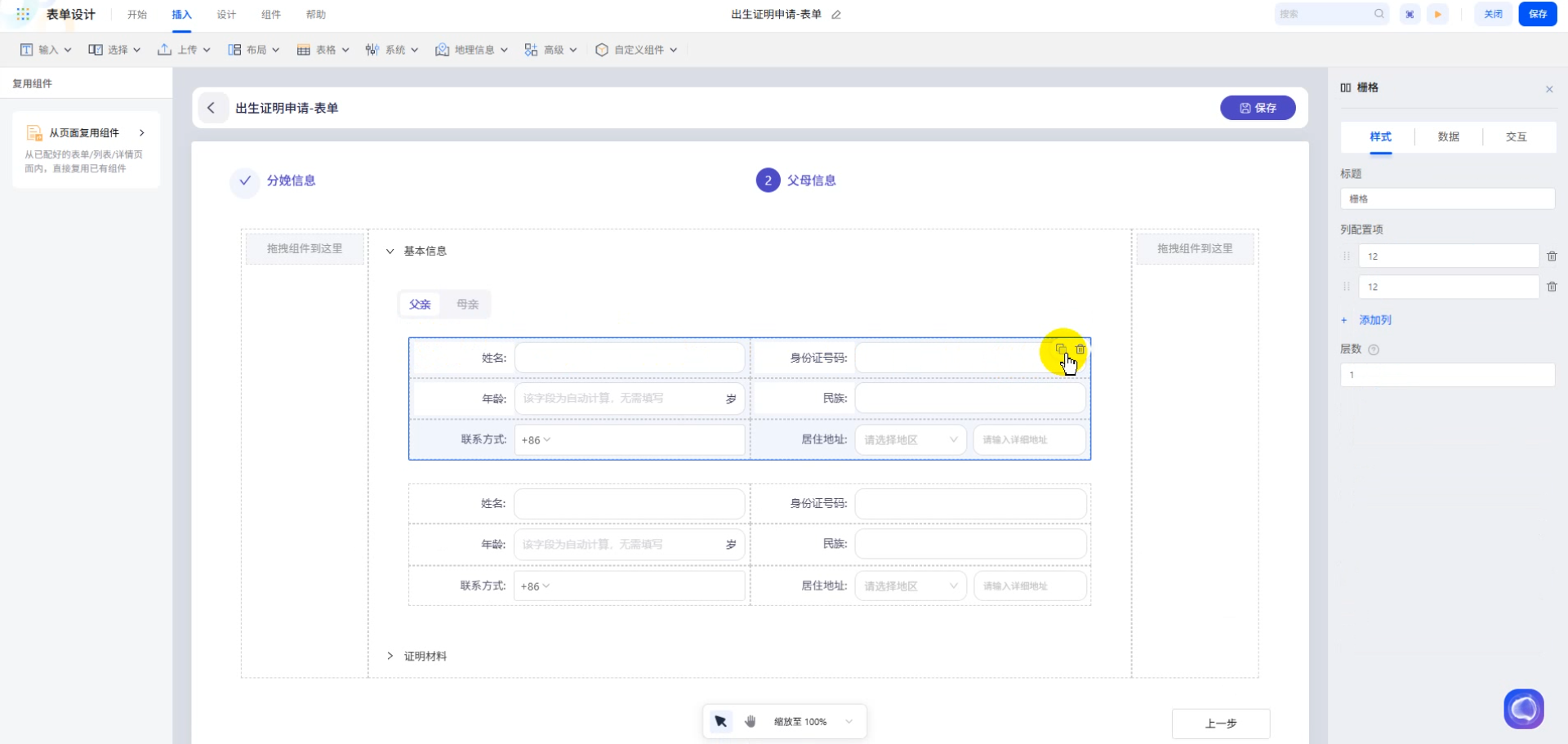 在“父亲信息”页签的栅格布局中,配置姓名、身份证号、年龄、联系方式、居住地址