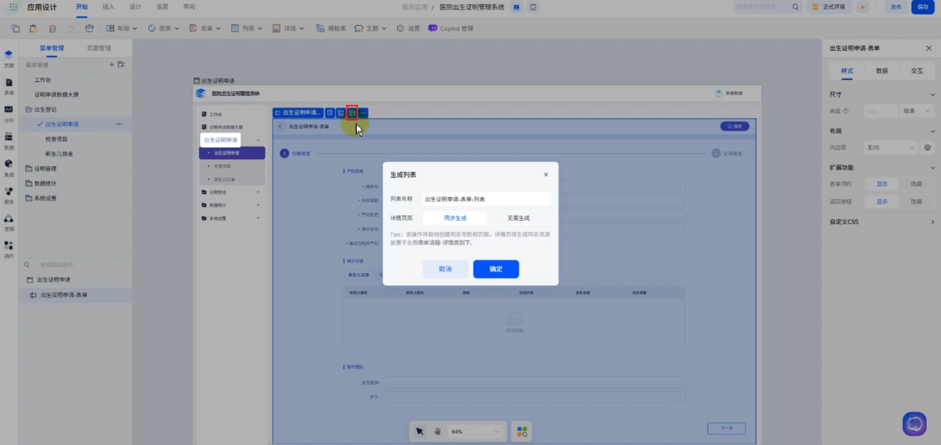 进入应用设计界面,新增【出生证明申请】菜单,拖入表单组件并双击进入配置。