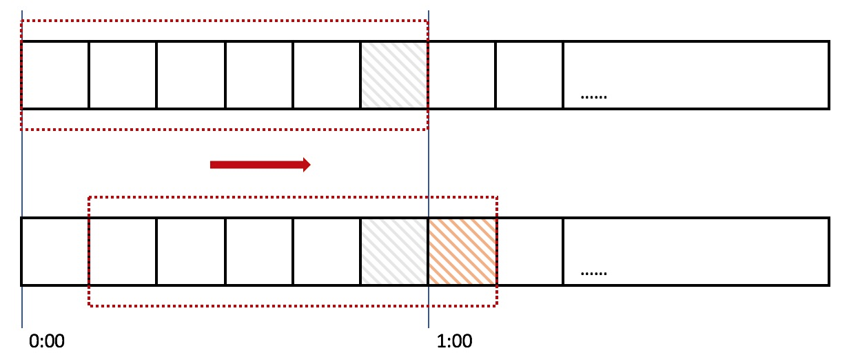 滑动窗口计数有两个关键的因素:窗口时长、滚动时间间隔。滚动时间间隔一般等于上图中的一个桶 bucket,窗口时长除以滚动时间间隔,就是一个窗口所包含的 bucket 数目。