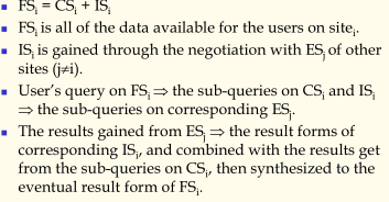 联邦式数据库的每个结点有充分的自治权,结点间通过协商后进行合作,完成系统。在联邦式数据库里没有统一的全局模式。联邦式数据库主要用来对异构的现有系统做集成。
