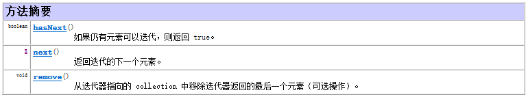 Iterator:对 collection 进行迭代的迭代器。迭代器取代了 Java Collections Framework 中的 Enumeration。迭代器与枚举有两点不同: