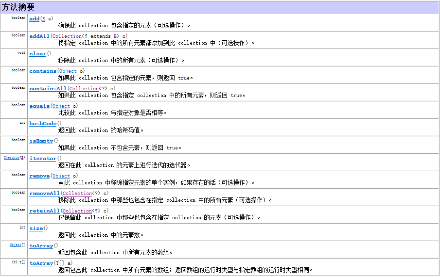 Collection 层次结构 中的根接口。Collection 表示一组对象,这些对象也称为 collection 的元素。一些 collection 允许有重复的元素,而另一些则不允许。一些 collection 是有序的,而另一些则是无序的。JDK 不提供此接口的任何直接 实现:它提供更具体的子接口(如 Set 和 List)实现。此接口通常用来传递 collection,并在需要最大普遍性的地方操作collection。