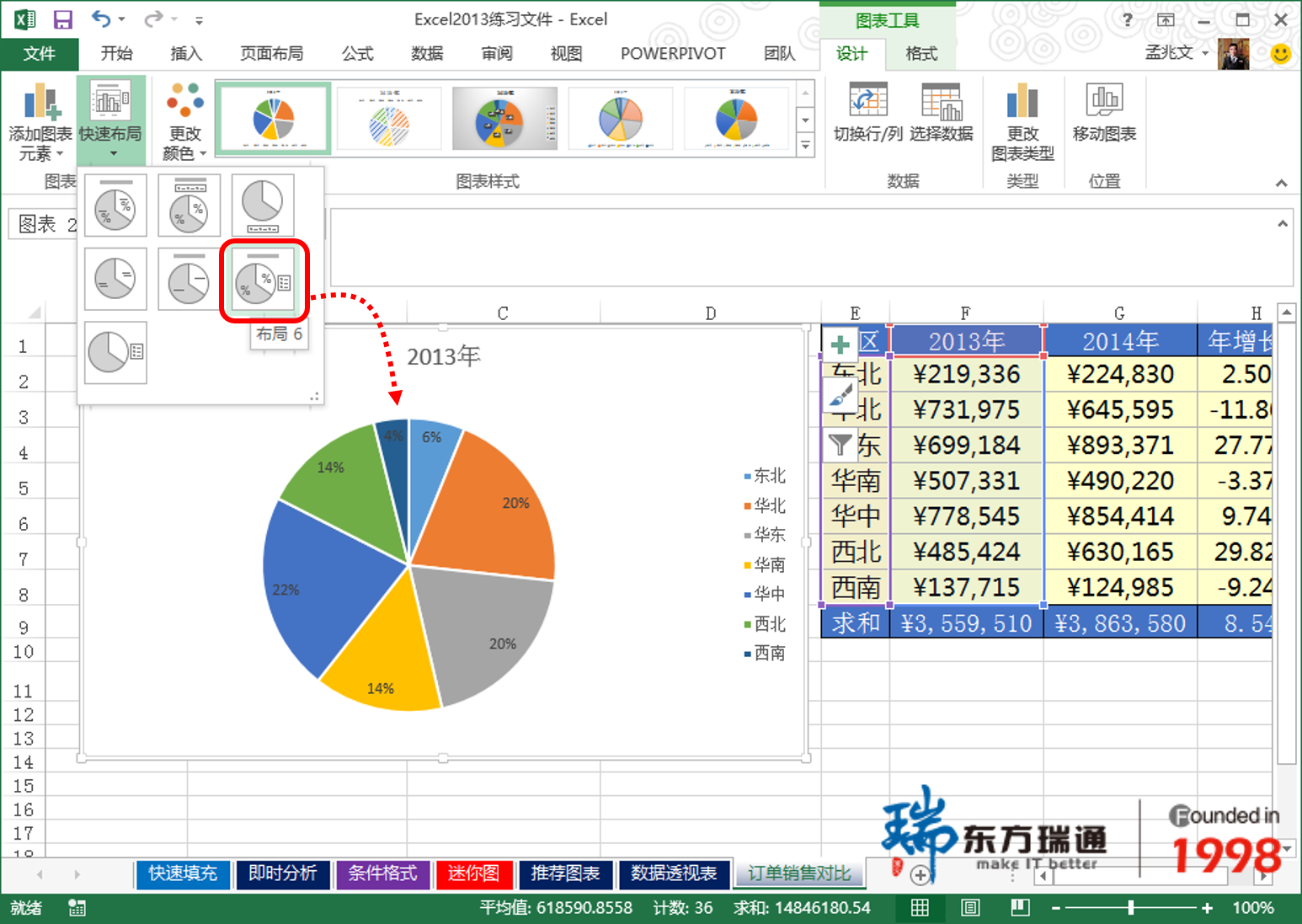 (2)创建完成的初始图表往往其外观效果并不是很理想,此时,可借助功能区中的“图表工具”进行快速的格式化。如在“设计”上下文选项卡的“图表布局”选项组单击打开【快速布局】列表,单击选择喜欢的样式完成布局修改。